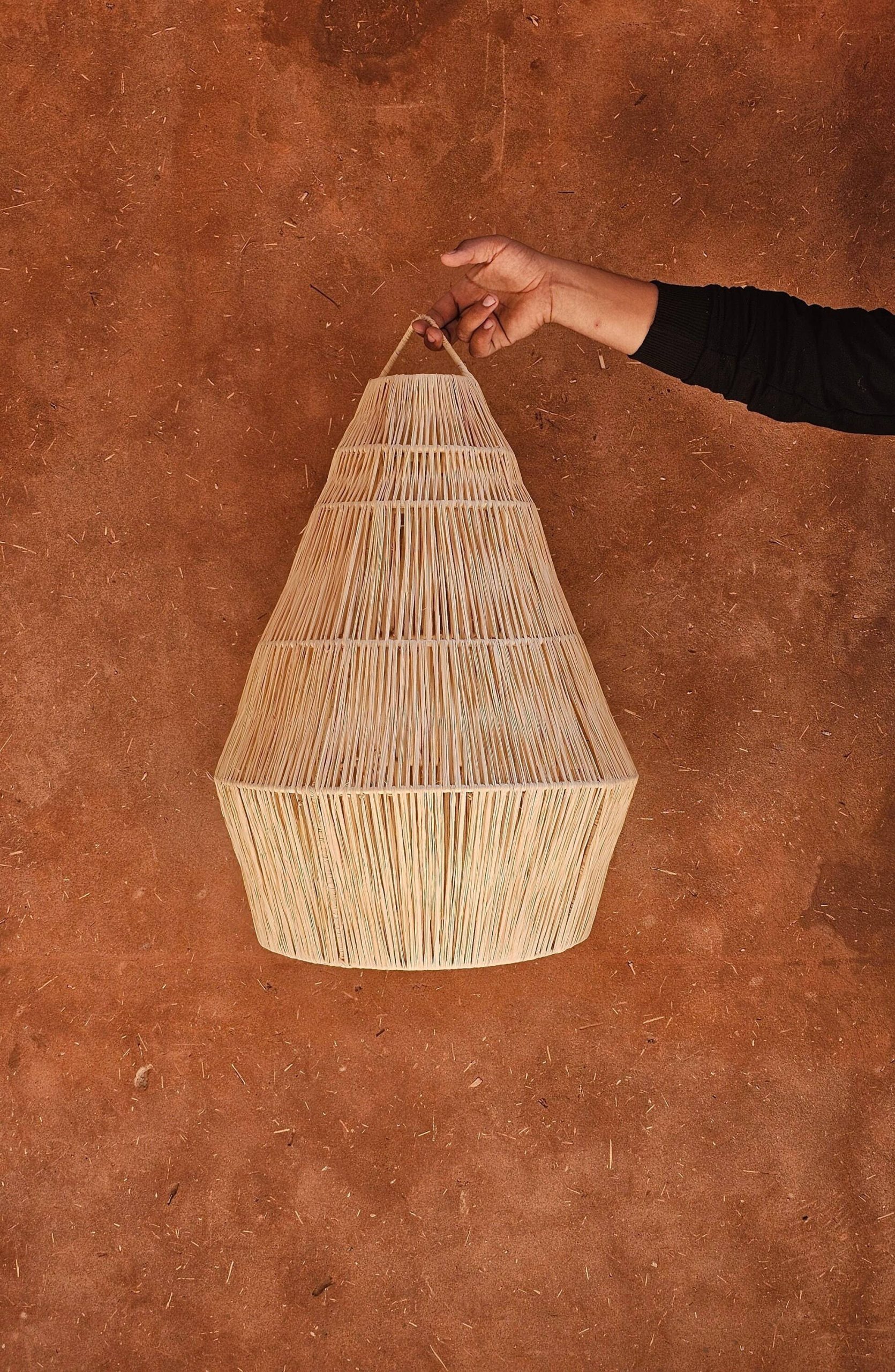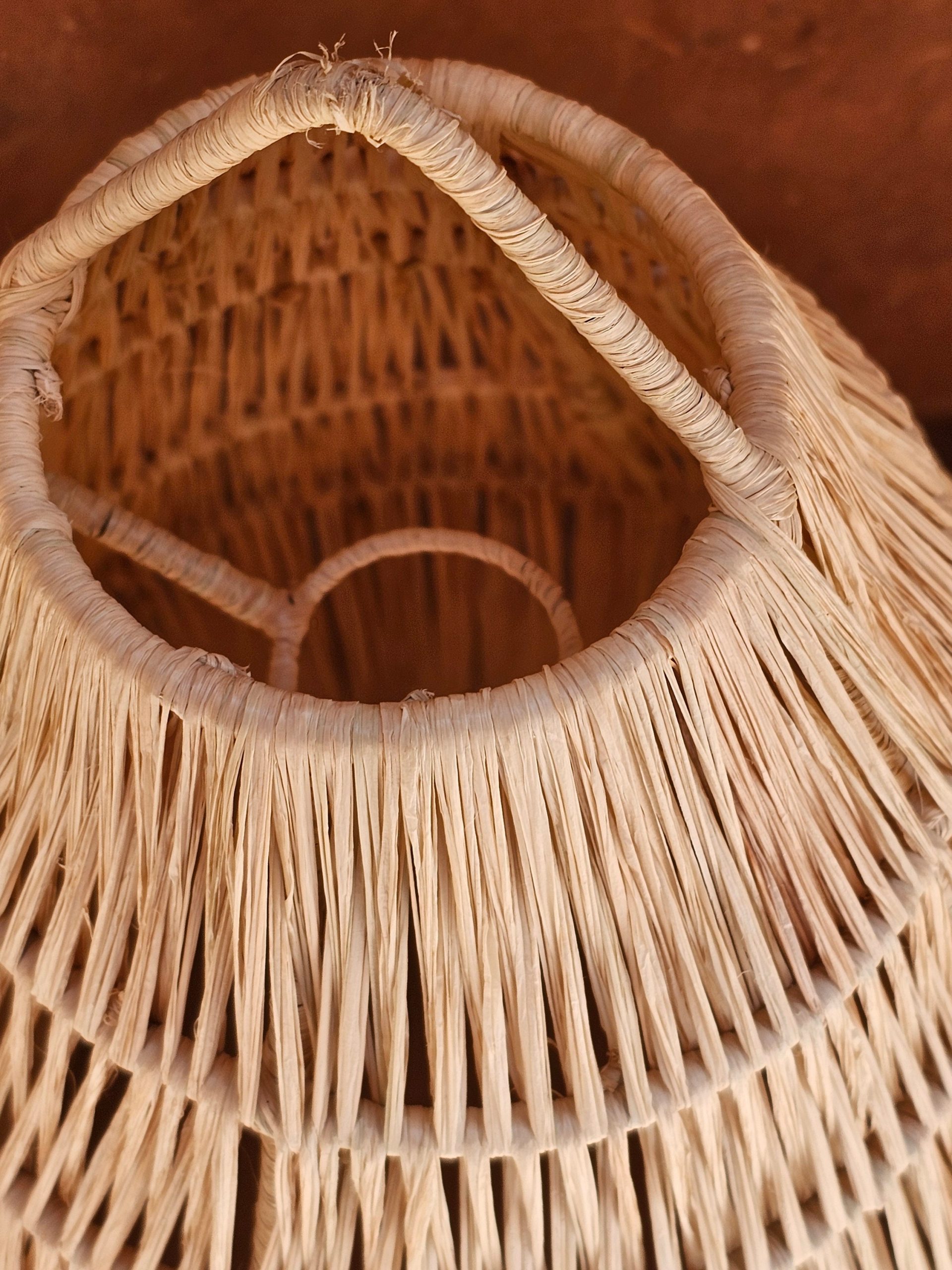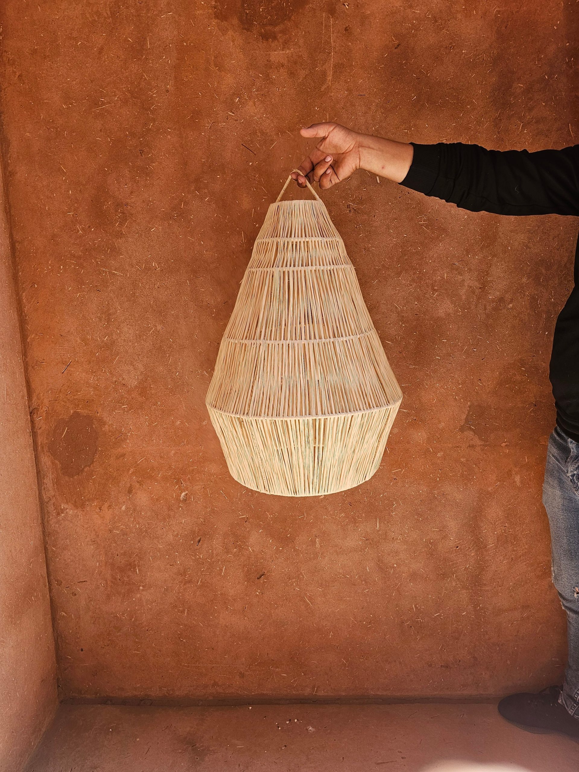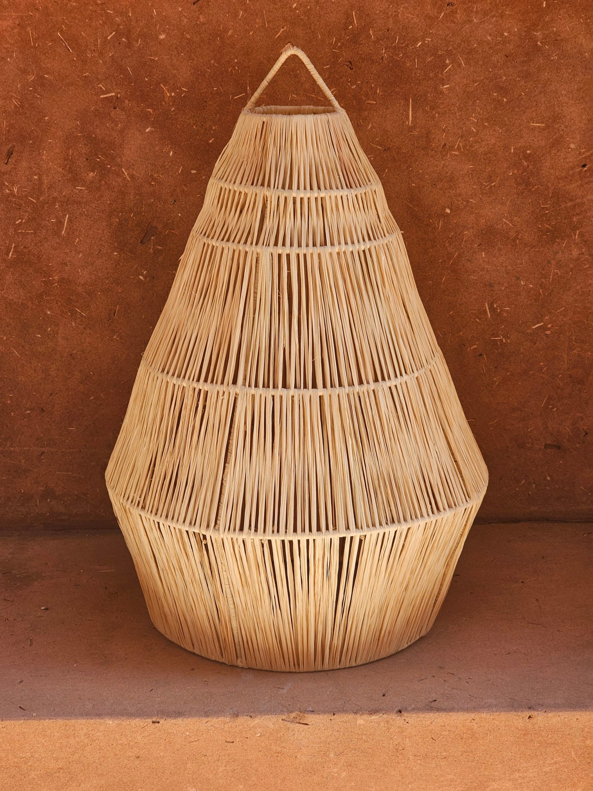 This raffia pendant light embodies the very essence of Moroccan craftsmanship, combining both aesthetic beauty and practical functionality. Handcrafted, it features a metal frame, offering a sturdy and elegant structure.