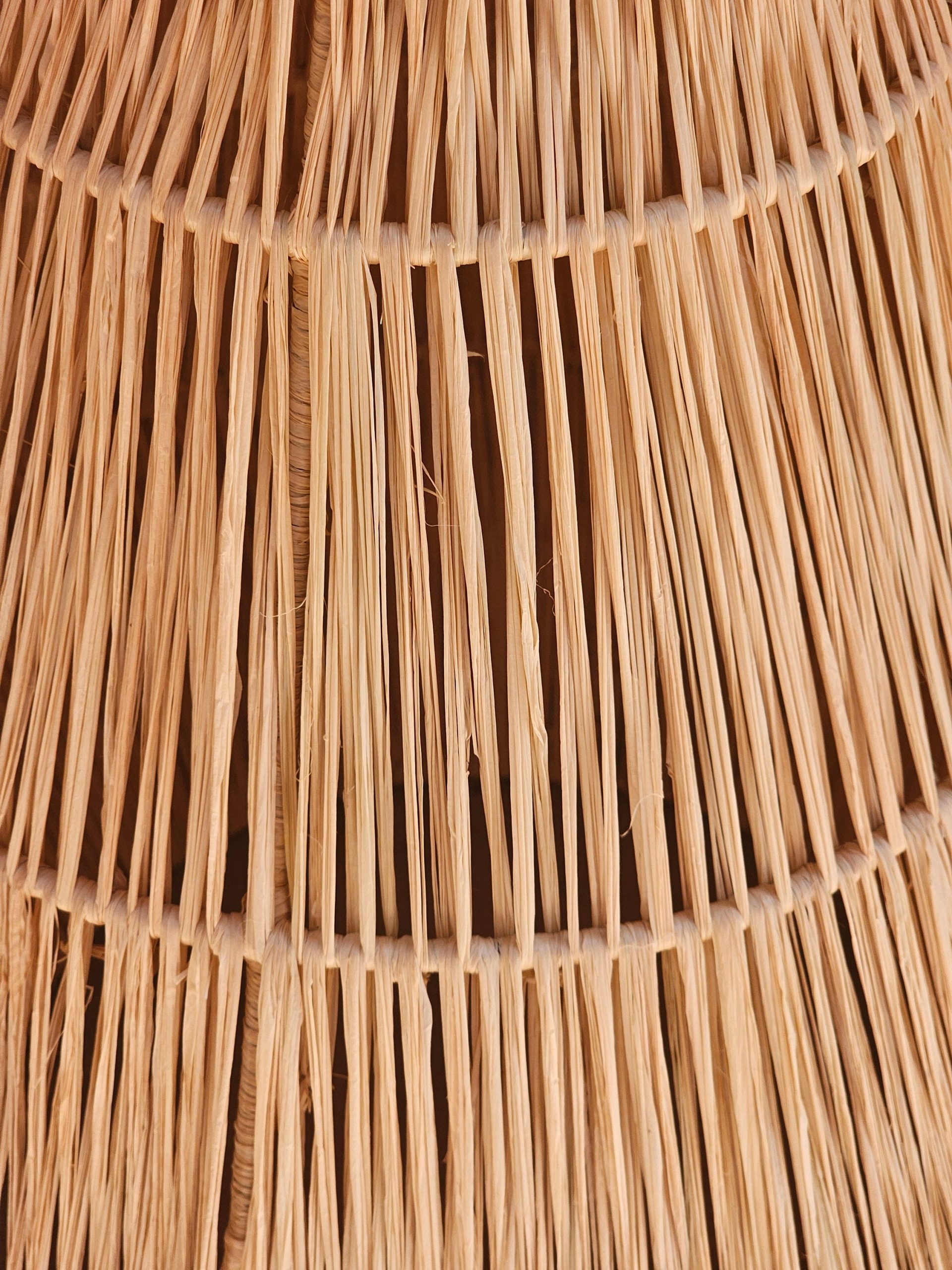 Raffia, a natural fiber derived from palm leaves, is the central element of this creation. Carefully woven, it adds a touch of authenticity and charm to the overall piece.