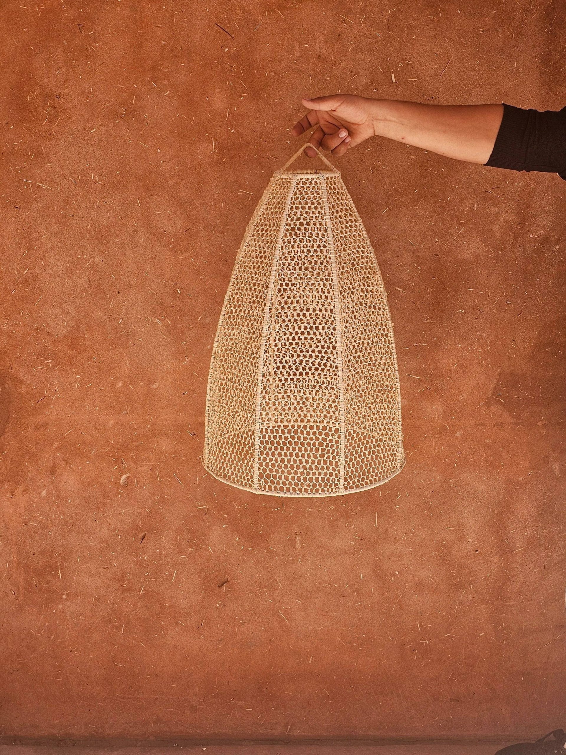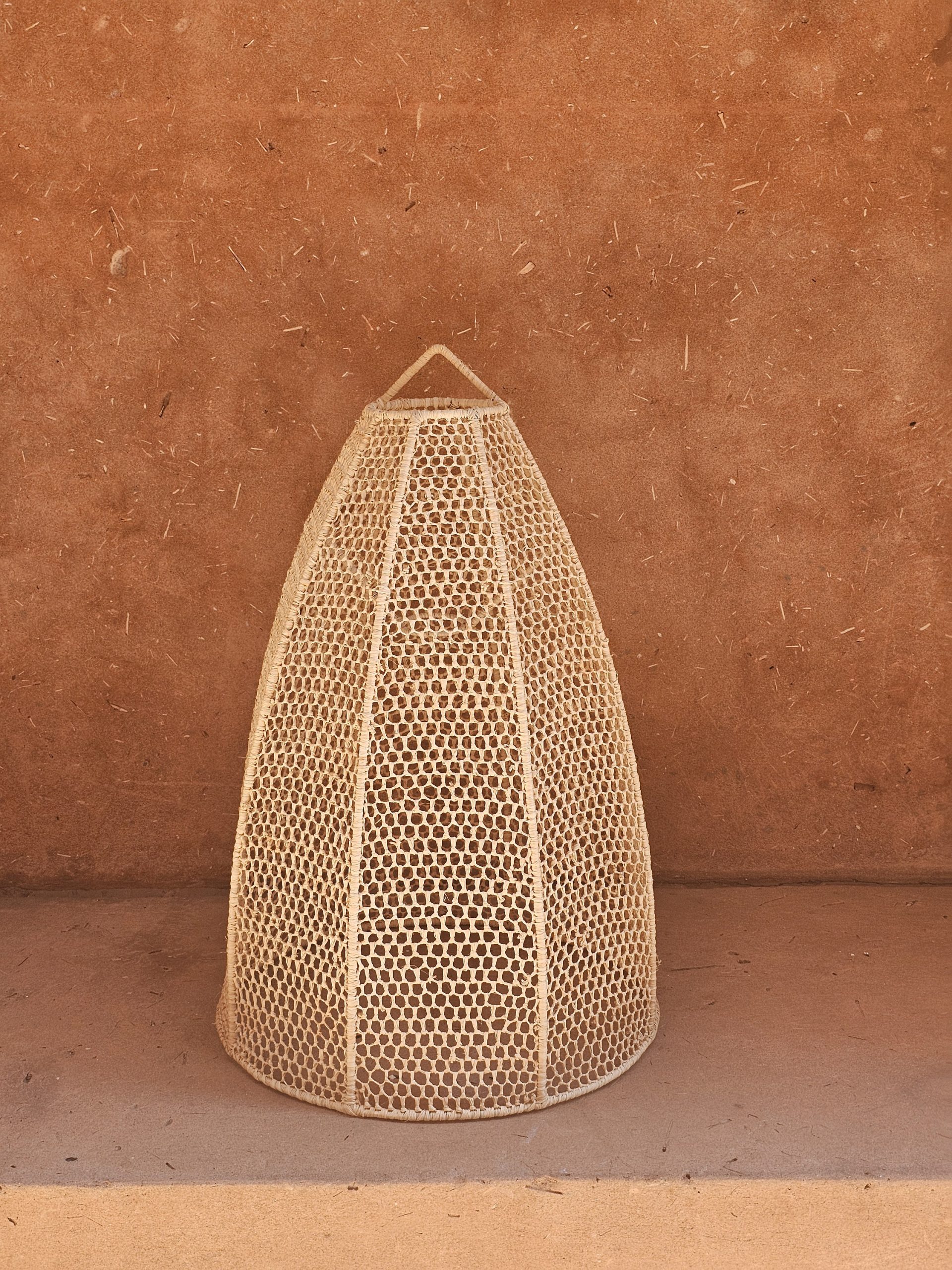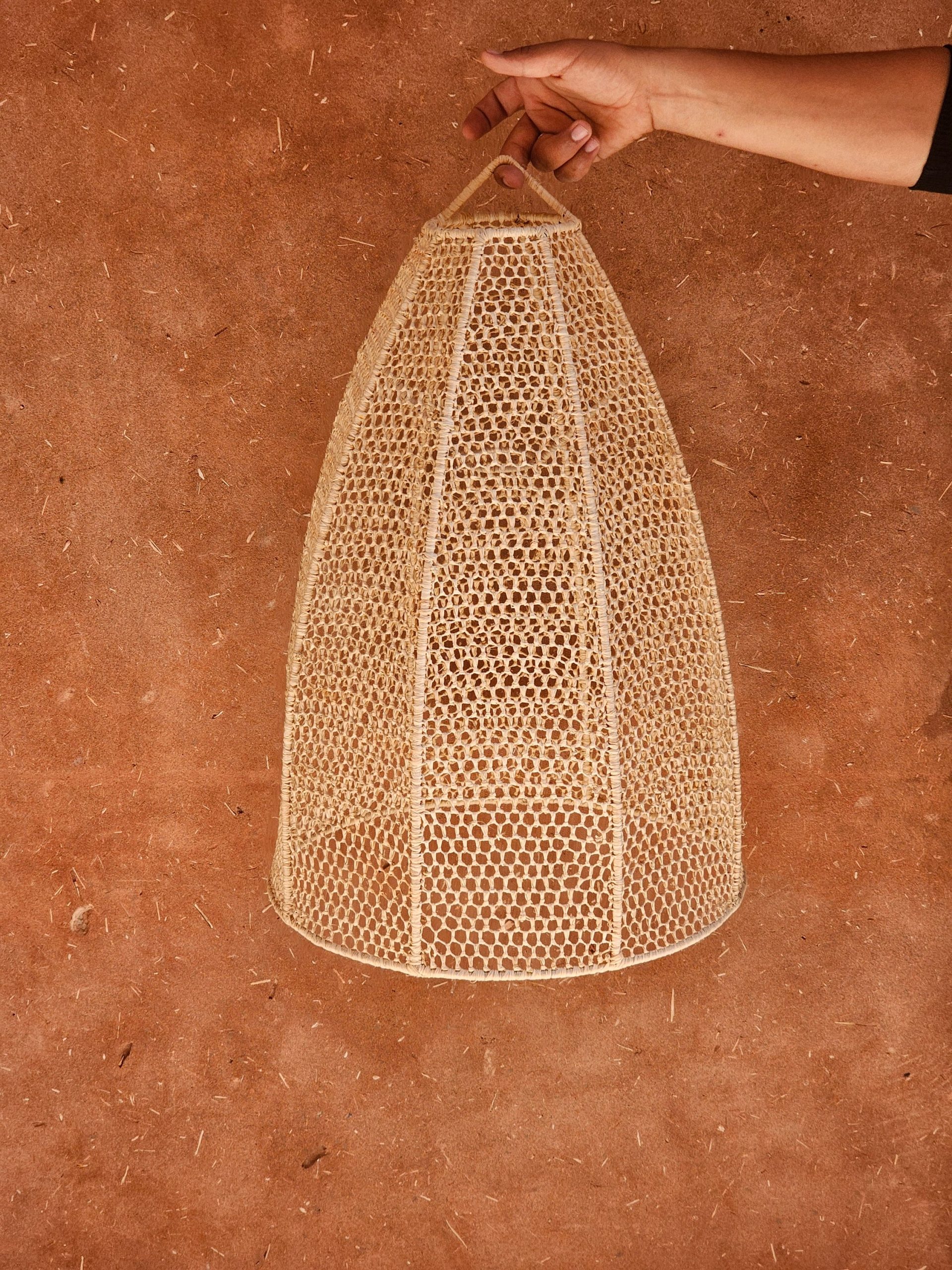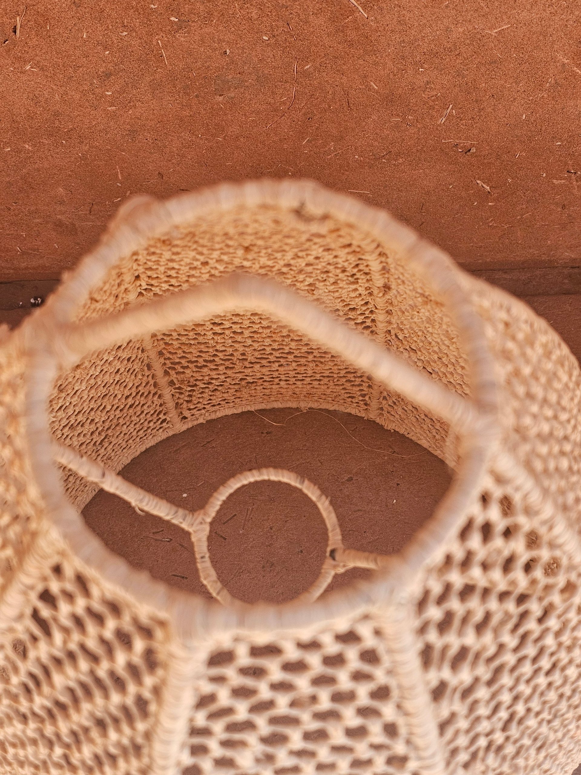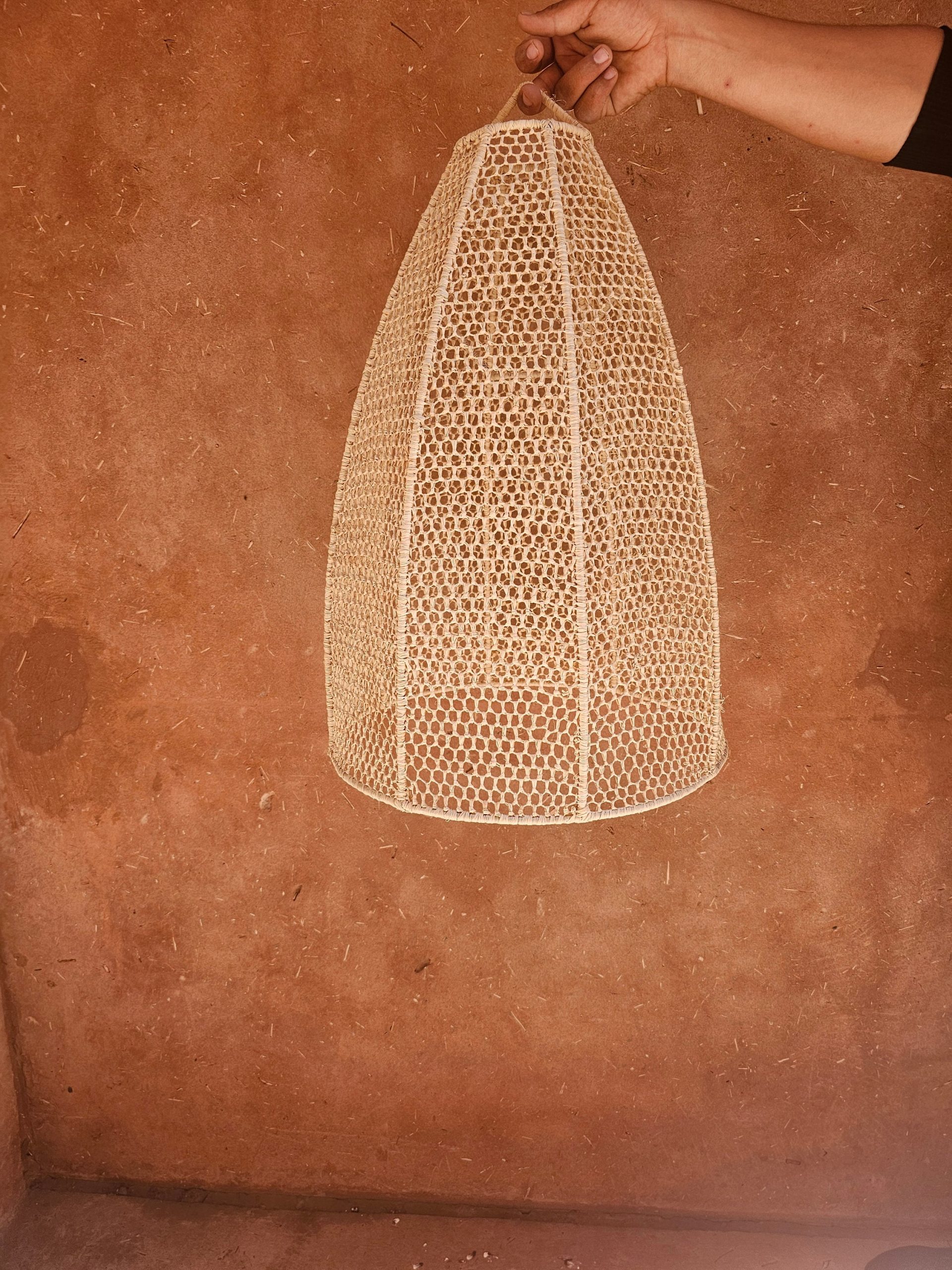 This raffia pendant light embodies the very essence of Moroccan craftsmanship, combining both aesthetic beauty and practical functionality. Handcrafted, it features a metal frame, offering a sturdy and elegant structure.