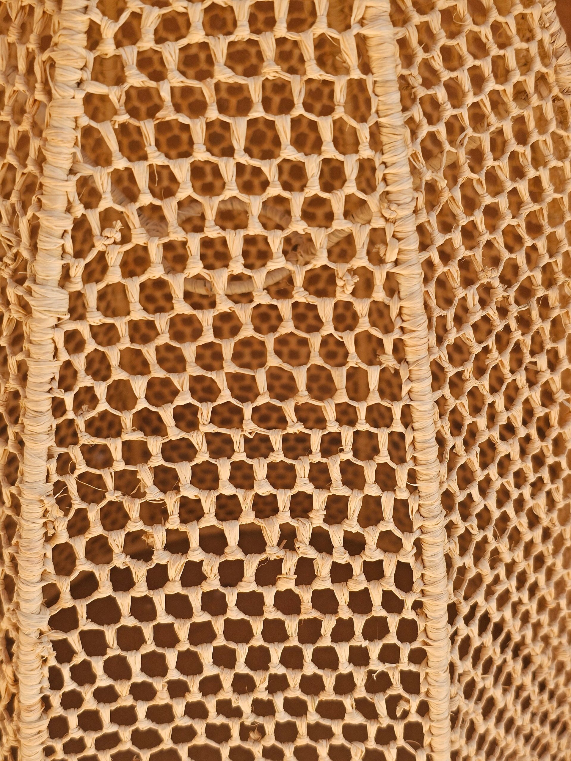 Raffia, a natural fiber derived from palm leaves, is the central element of this creation. Carefully woven, it adds a touch of authenticity and charm to the overall piece.