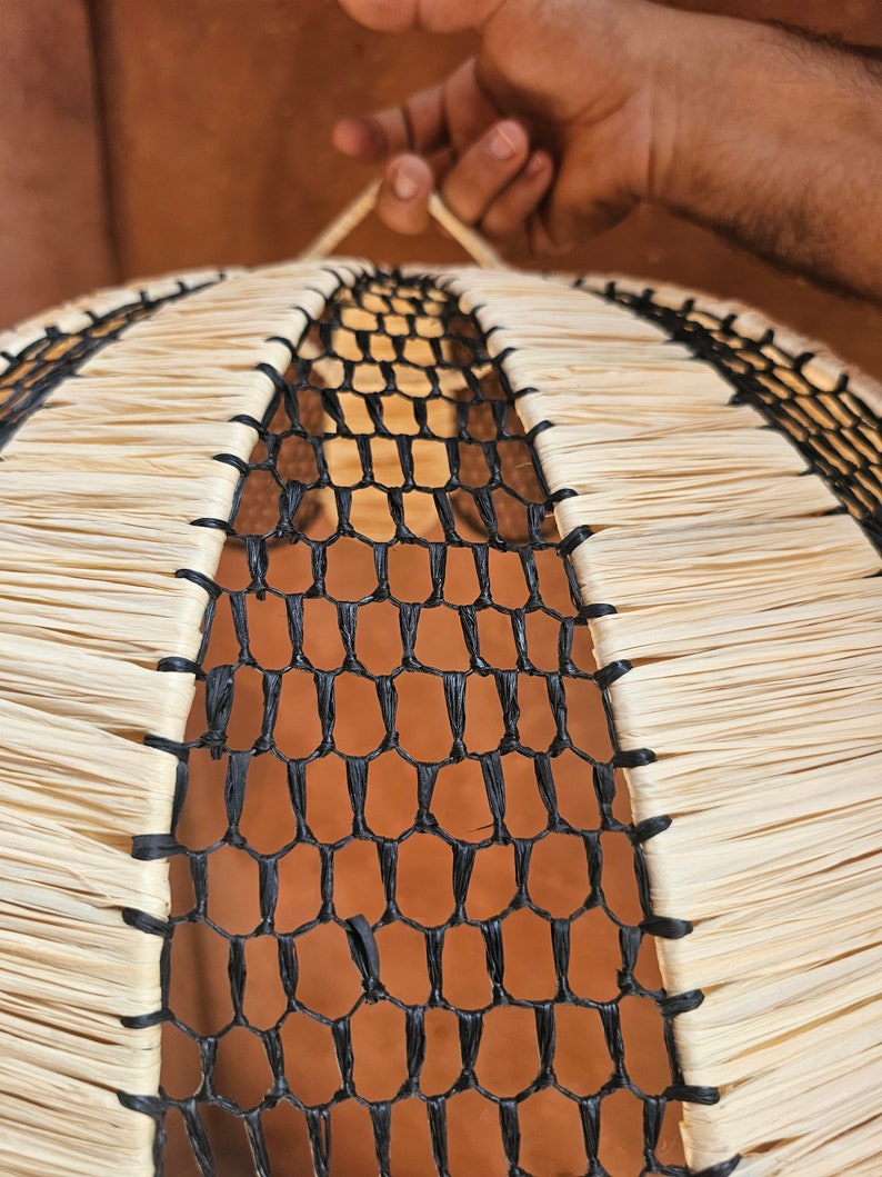 Raffia, a natural fiber derived from palm leaves, is the central element of this creation. Carefully woven, it adds a touch of authenticity and charm to the overall piece.