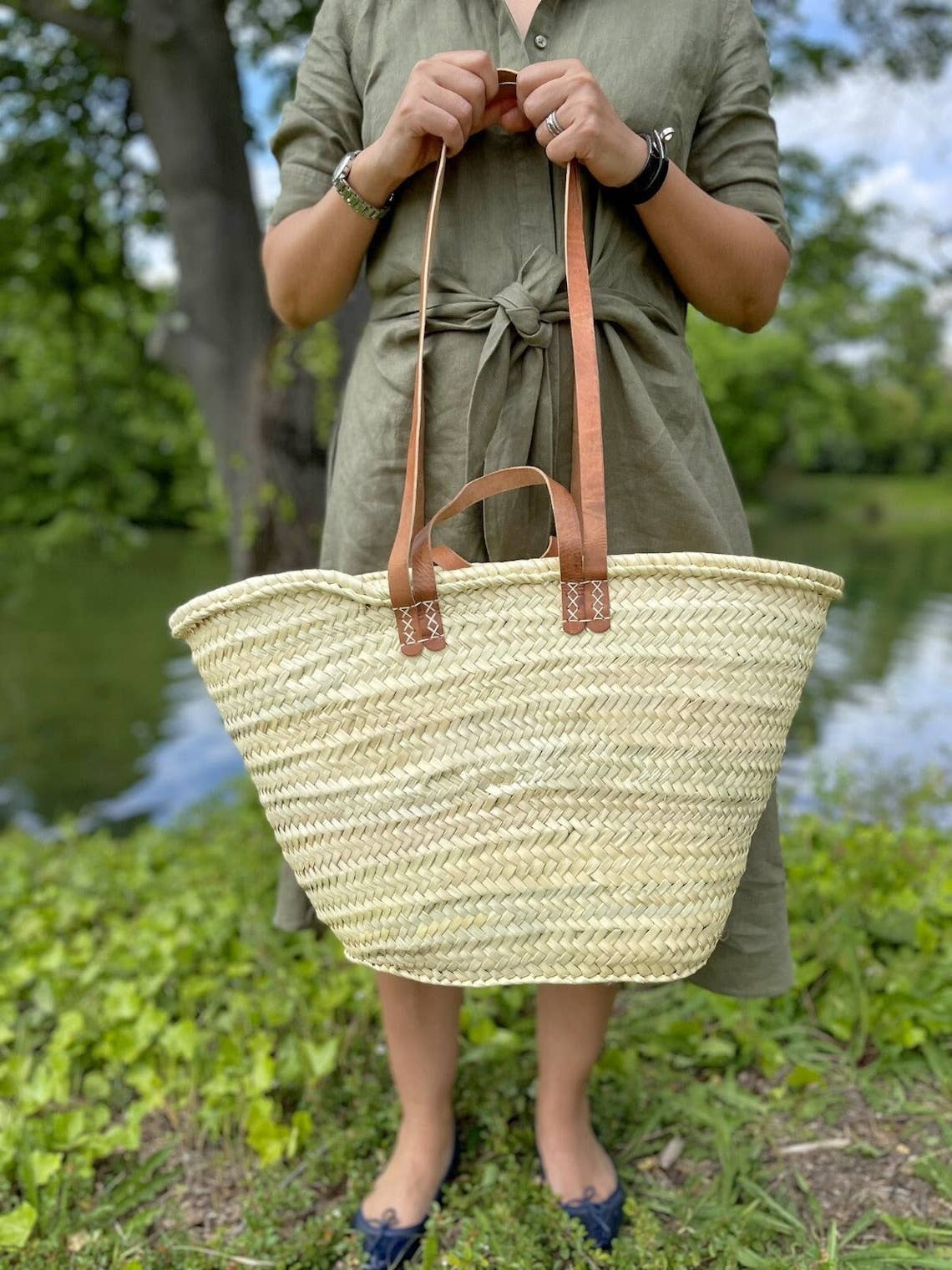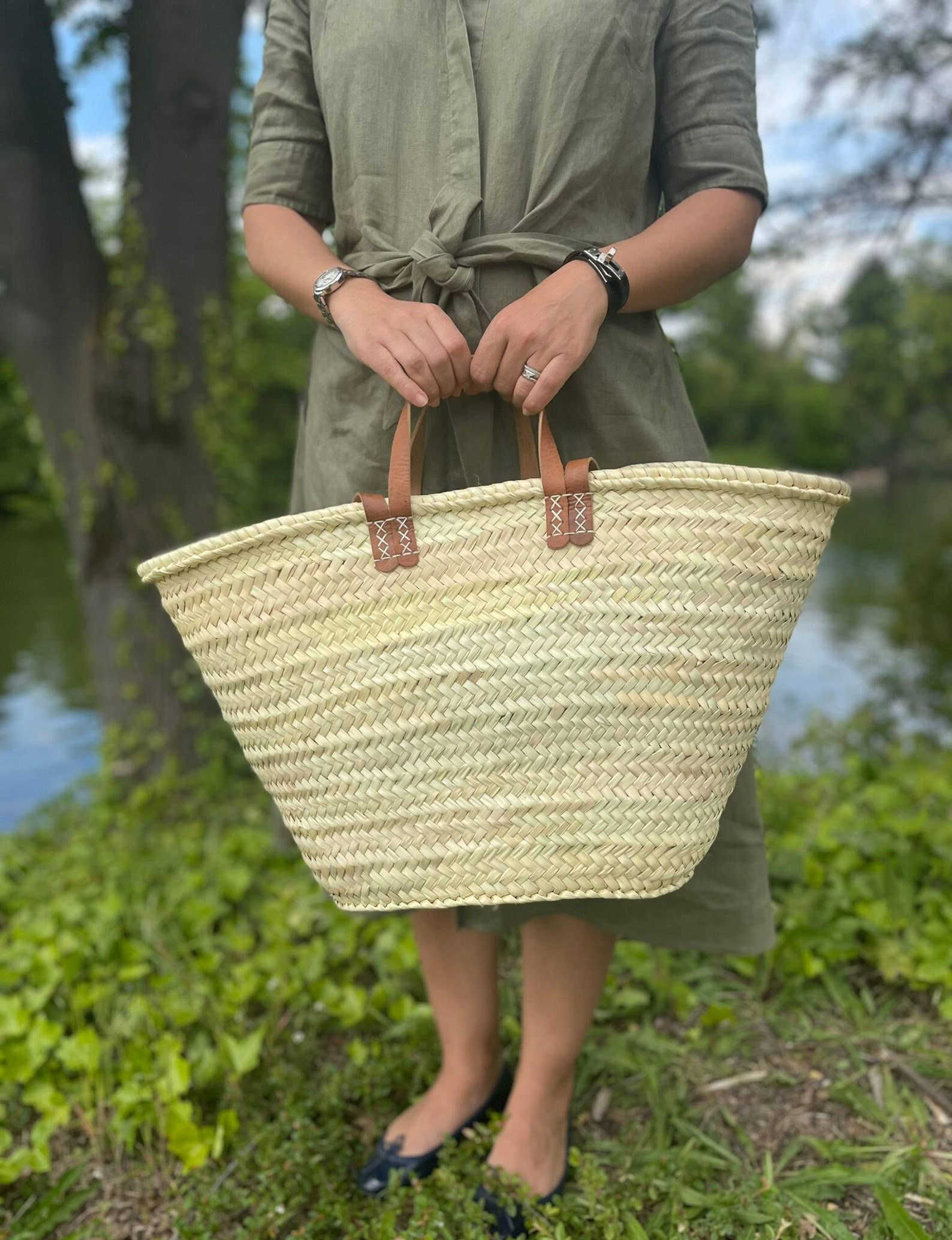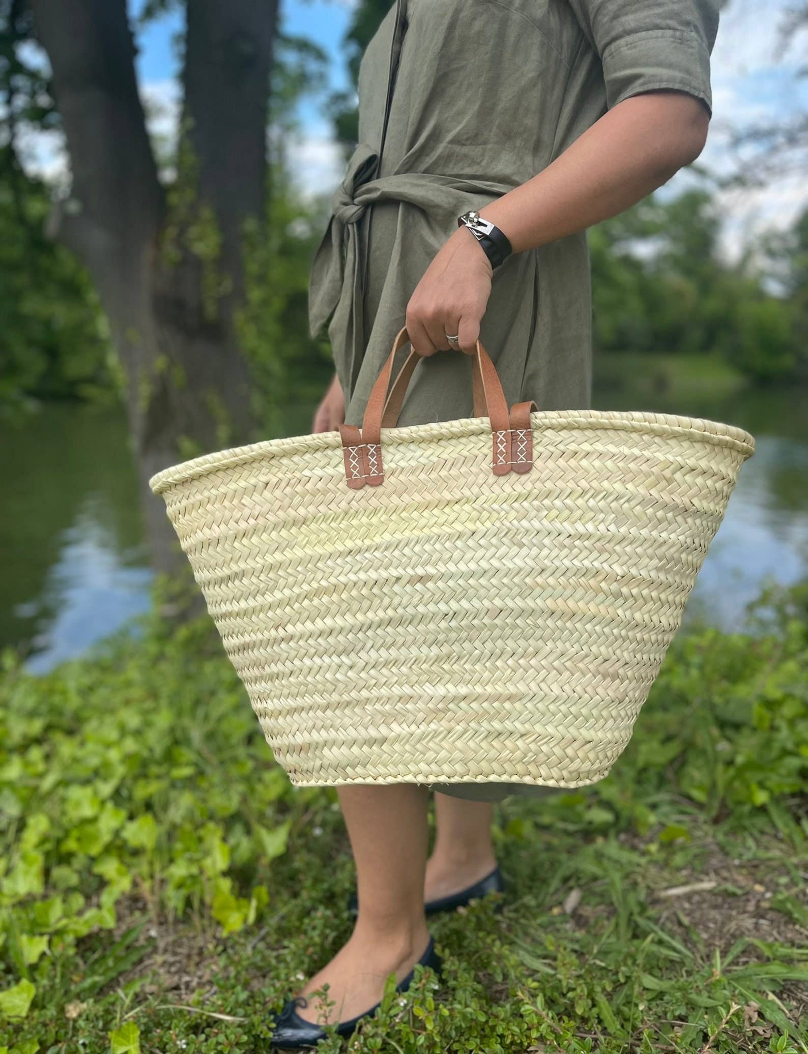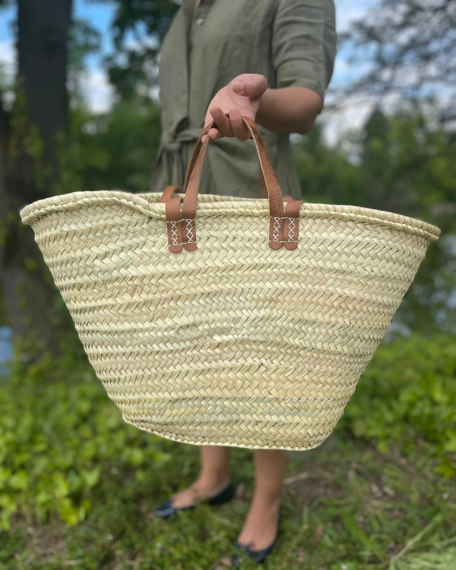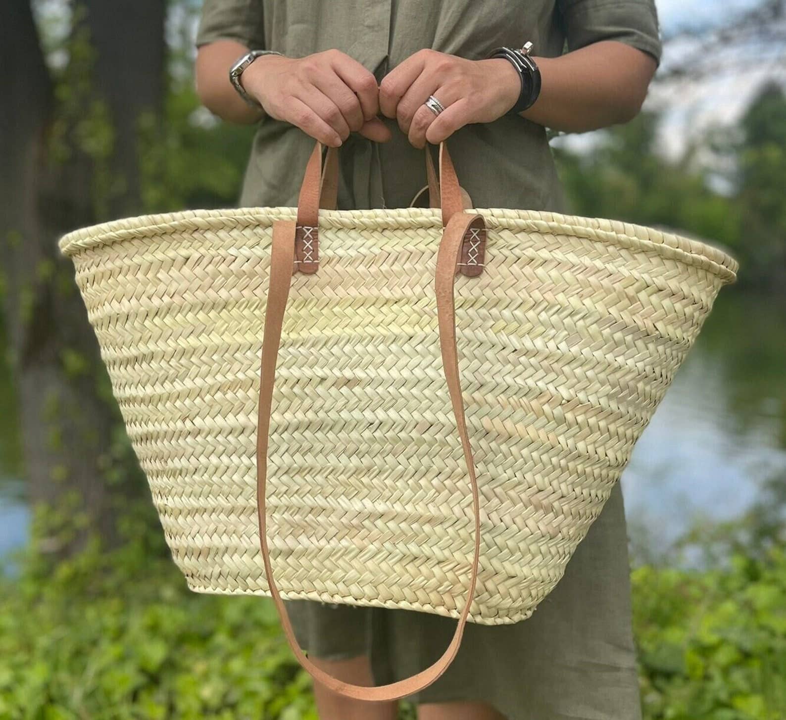 A handmade woven straw bag with leather handles, perfect as a gift for women. This Moroccan basket is handmade with natural straw and leather, making it a lovely straw handbag as a gift for women.
