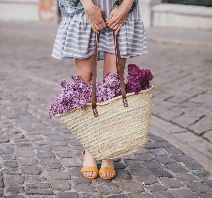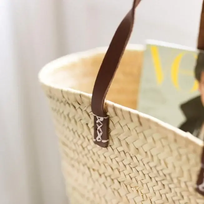 This French market classic is handwoven in Morocco from date palm leaves, creating a rich chevron texture from sturdy natural fibers. Anchored by leather tabs, the double straps allow the basket to easily transition from tote bag to shoulder bag.