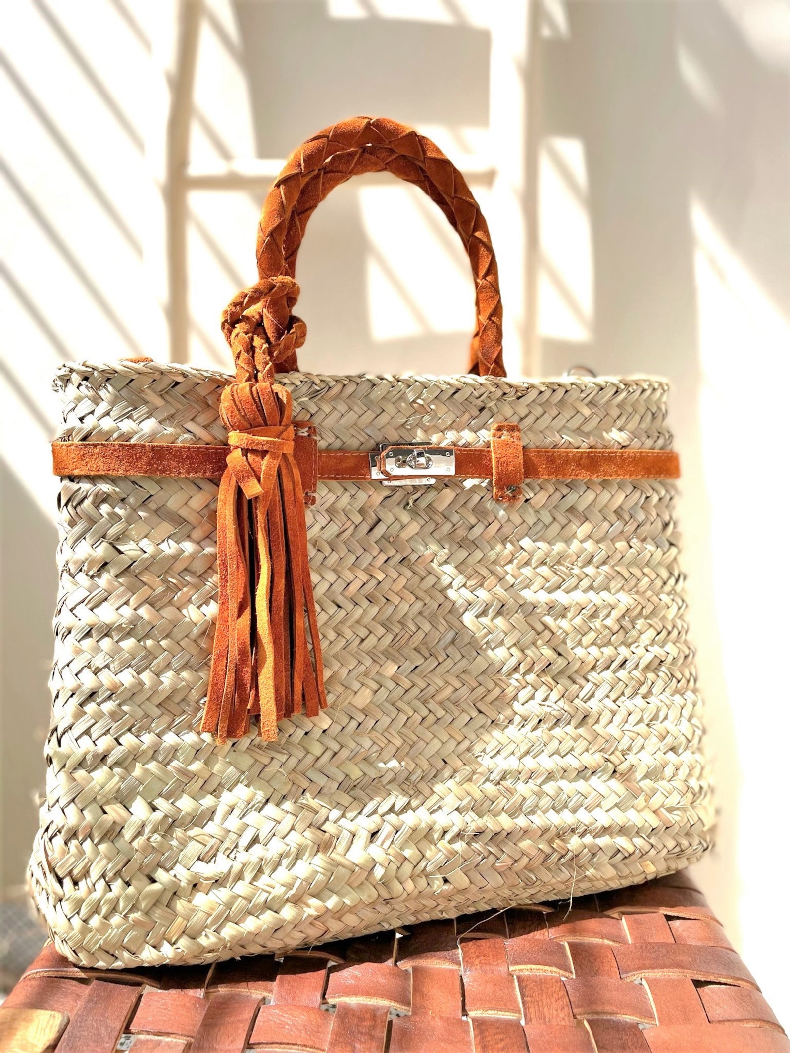 The basket is made of palm leaves which may be slightly green. They dry over time to become yellow/beige.