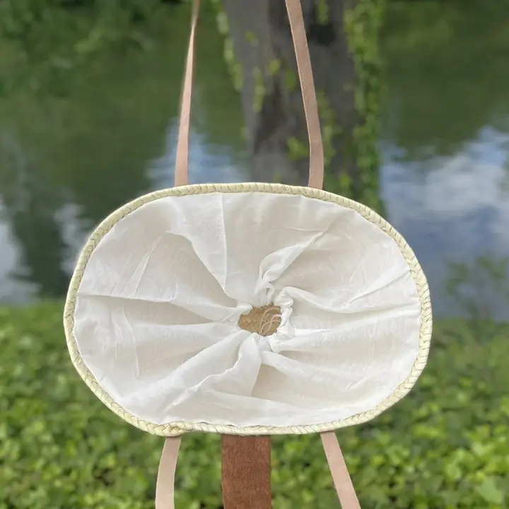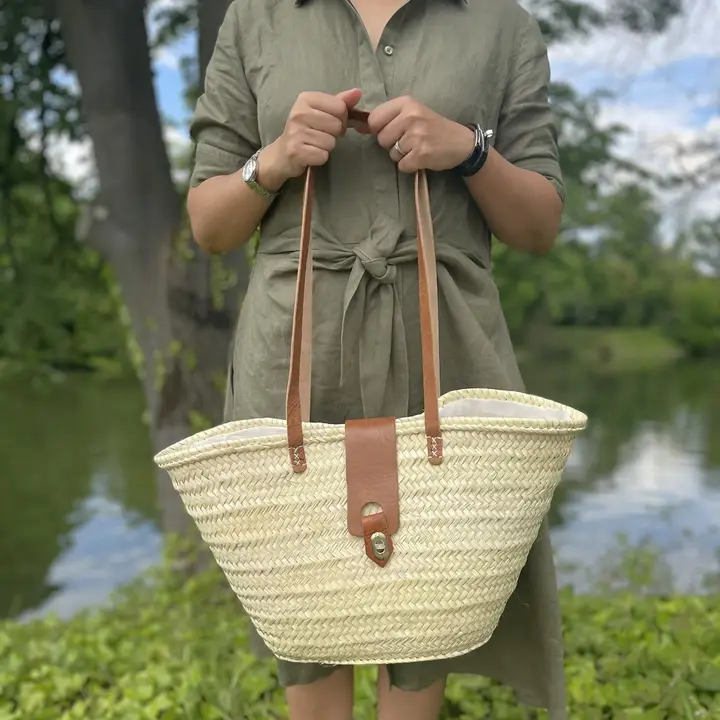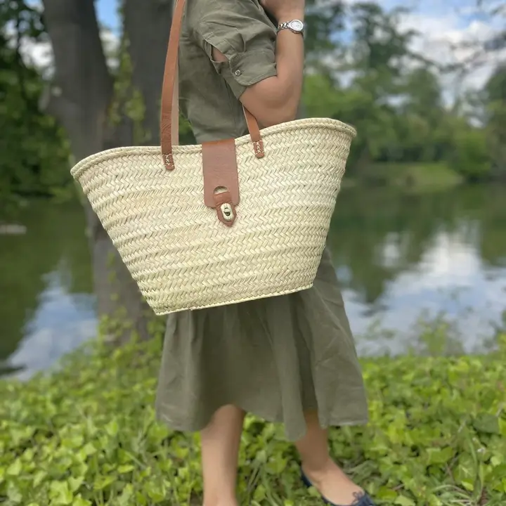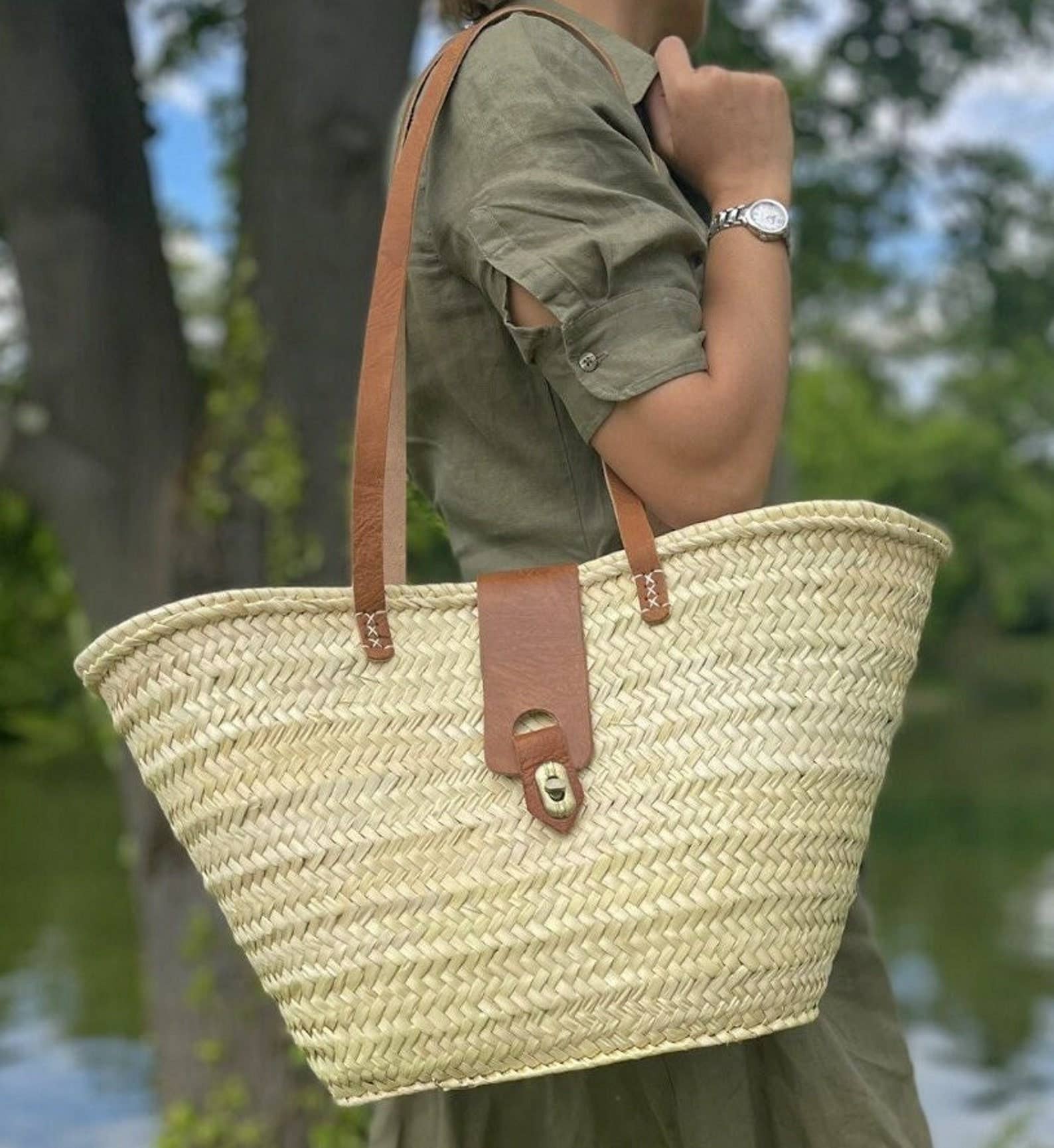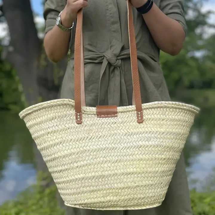 Handwoven in Morocco with durable palm leaves and leather handles just long enough to go over the shoulder. It also has the advantage of a leather buckle and strap to protect everything inside.